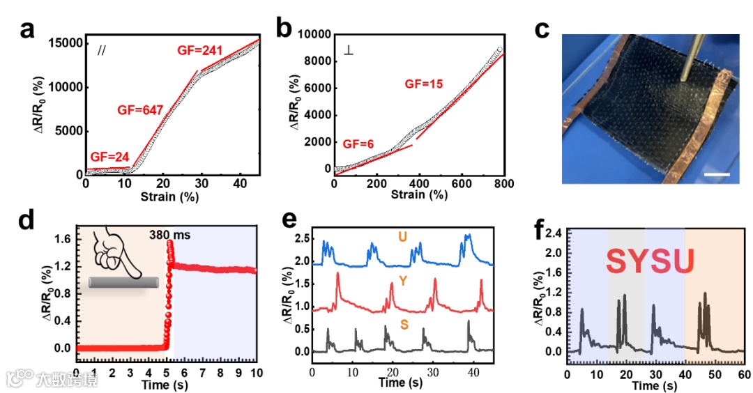 图4 复合水凝胶在(a)平行和(b)垂直于碳纤维方向的传感灵敏度;(c)碳纤维编织布复合水凝胶书板照片,标尺:2 cm;(d)书写板的响应时间;(e,f)在书写板上分别写出字母“S”、“Y”、“U”和“SYSU”对应的电阻变化率。