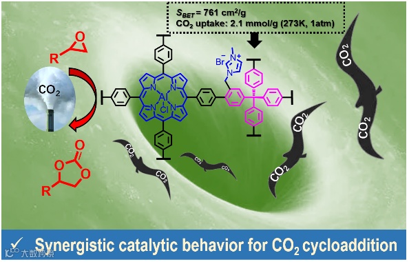 CO2捕集及化学转化技术是实现国家“双碳”战略目标的重要手段之一。由环氧化物与CO2反应制备环状碳酸酯是CO2资源化利用的重要途径。受大自然的启发,金属卟啉基多孔有机聚合物(POPs)作为先进的仿生纳米反应器,在CO2多相催化转化方面受到了广泛的关注。这是因为将高活性的催化位点固定在多孔基质中,活性位点不仅能够得到适当的保护,而且可以被底物分子紧密接触,从而比均相催化剂具有更高的催化性能,可能成为沟通均相催化与多相催化的桥梁。近几年以来,基于环氧化物双重活化模型的双功能催化剂设计策略被认为是最有前途的方法之一。其中直接缩合策略(Direct Condensation Strategy)是利用有机合成的方法,以功能化离子液体和金属卟啉为原料,通过共价键联的方式设计与合成金属卟啉基多孔离子液体聚合物(PIPs)。亲核卤素阴离子与Lewis酸金属中心之间的协同催化作用可以有效地促进环氧化物的开环,实现在温和条件下CO2分子的活化,从而在不添加任何助剂条件下制备环状碳酸酯。但是,由于带电基团之间的静电相互作用往往会导致离子单体的反应活性较差或引起高度不规则的堆叠结构,从而导致PIPs往往比表面积降低和反应传质限制。
