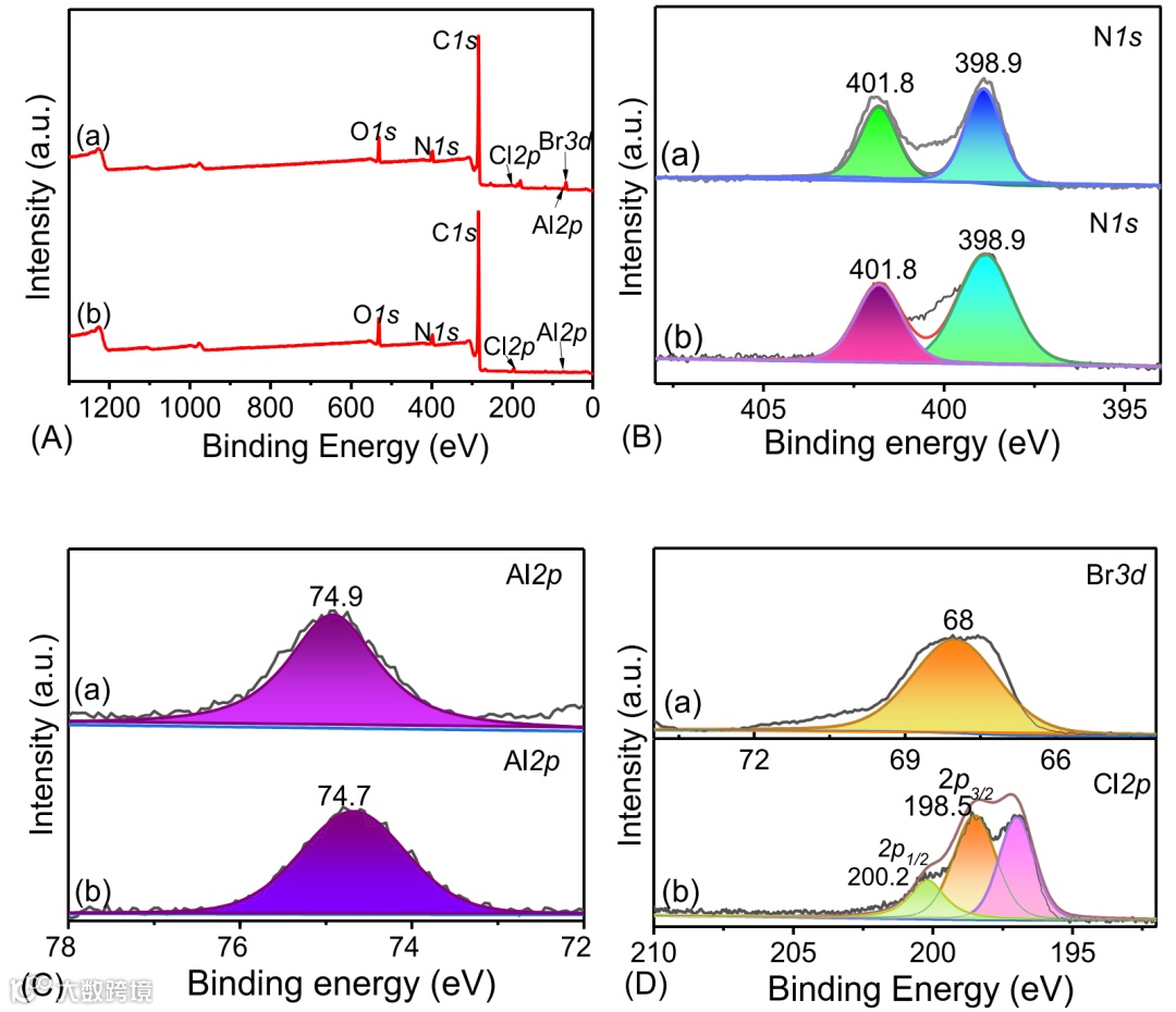 Figure 2. (A) Total, (B) N1s, (C) Al2p and (D) Br3d or Cl2p XPS spectra of (a) AlPor-PIP-Br and (b) AlPor-PIP-Cl.