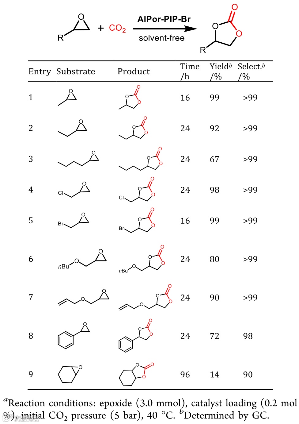 Table 2. Results of the cycloaddition reaction of CO2 and various epoxides over AlPor-PIP-Br