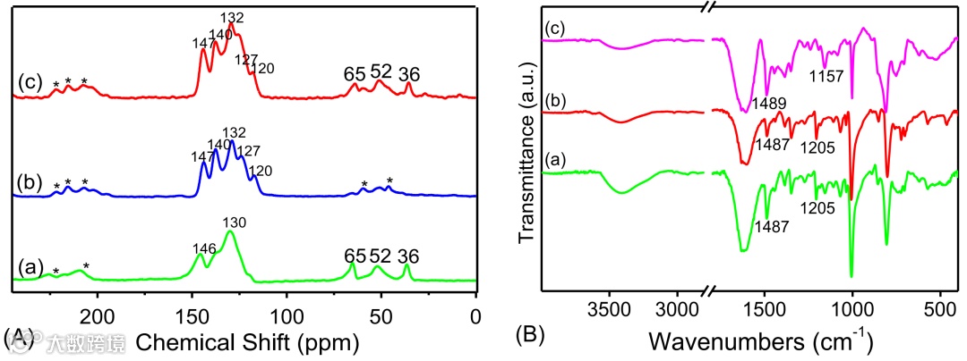 Figure 1. (A) 13C MAS NMR spectra of (a) iPAF-Cl, (b) AlPor-CMP and (c) AlPor-PIP-Cl. Asterisks (*) denote spinning sidebands; (B) FT-IR spectra of (a) iPAF-Cl, (b) AlPor-PIP-Cl and (c) AlPor-PIP-Br.