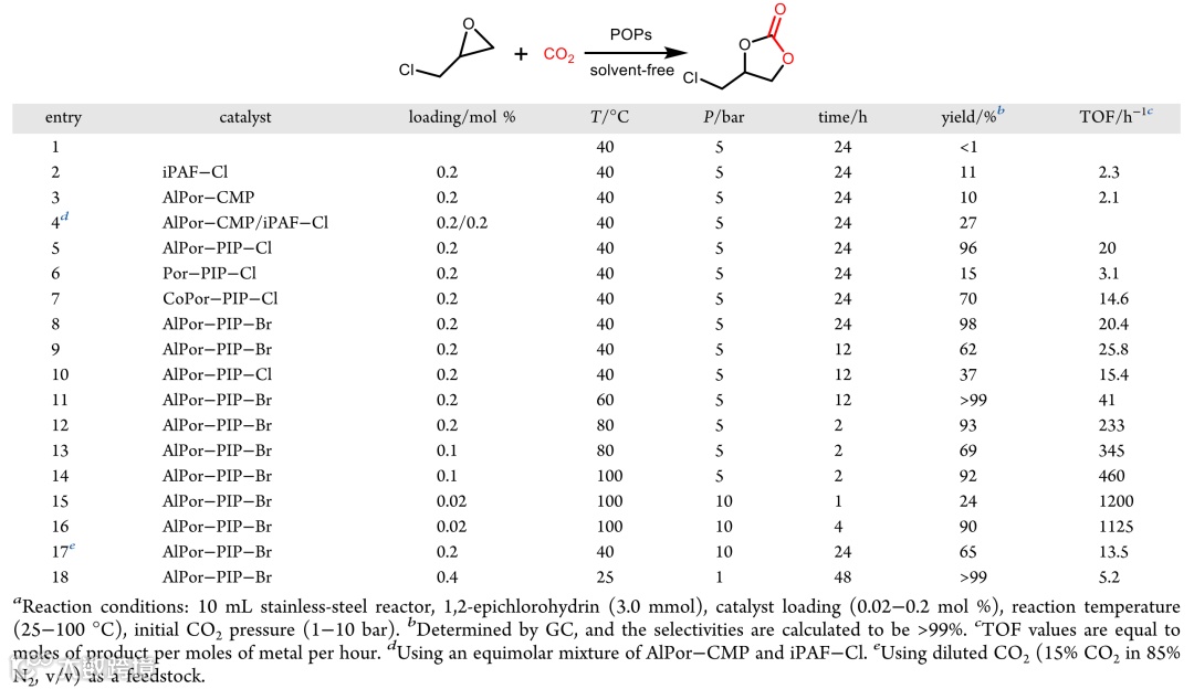 Table 1. Results of the cycloaddition reaction of CO2 with 1,2-epichlorohydrin over various POP-based catalysts discussed here.