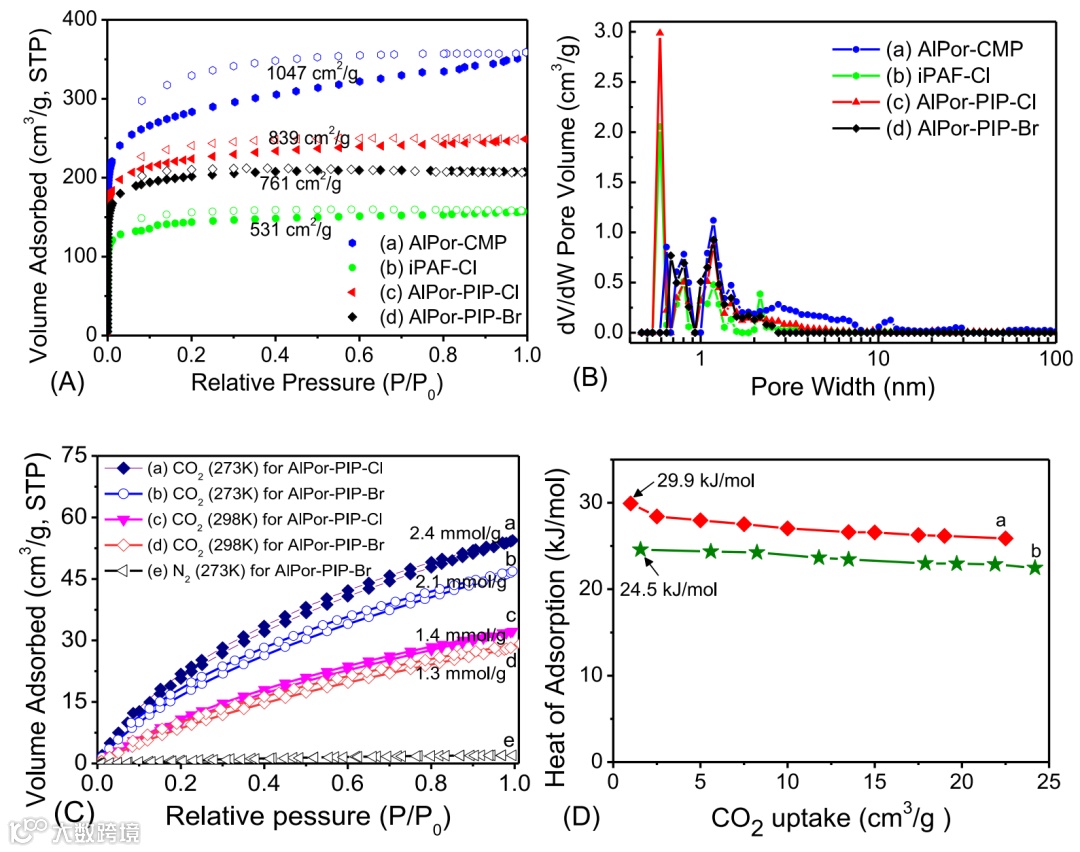Figure 4. (A) N2 adsorption-desorption isotherms of (a) AlPor-CMP, (b) iPAF-Cl, (c) AlPor-PIP-Cl and (d) AlPor-PIP-Br measured at 77 K and standard temperature and pressure conditions (STP); (B) pore-size distribution curves of (a) AlPor-CMP, (b) iPAF-Cl, (c) AlPor-PIP-Cl and (d) AlPor-PIP-Br calculated by NLDFT method; (C) CO2 or N2 sorption isotherms for AlPor-PIP-Cl and AlPor-PIP-Br measured at 273 K (a, b, e) and 298 K (c, d); (D) Isosteric heat of CO2 adsorption of (a) AlPor-PIP-Cl and (b) AlPor-PIP-Br.
