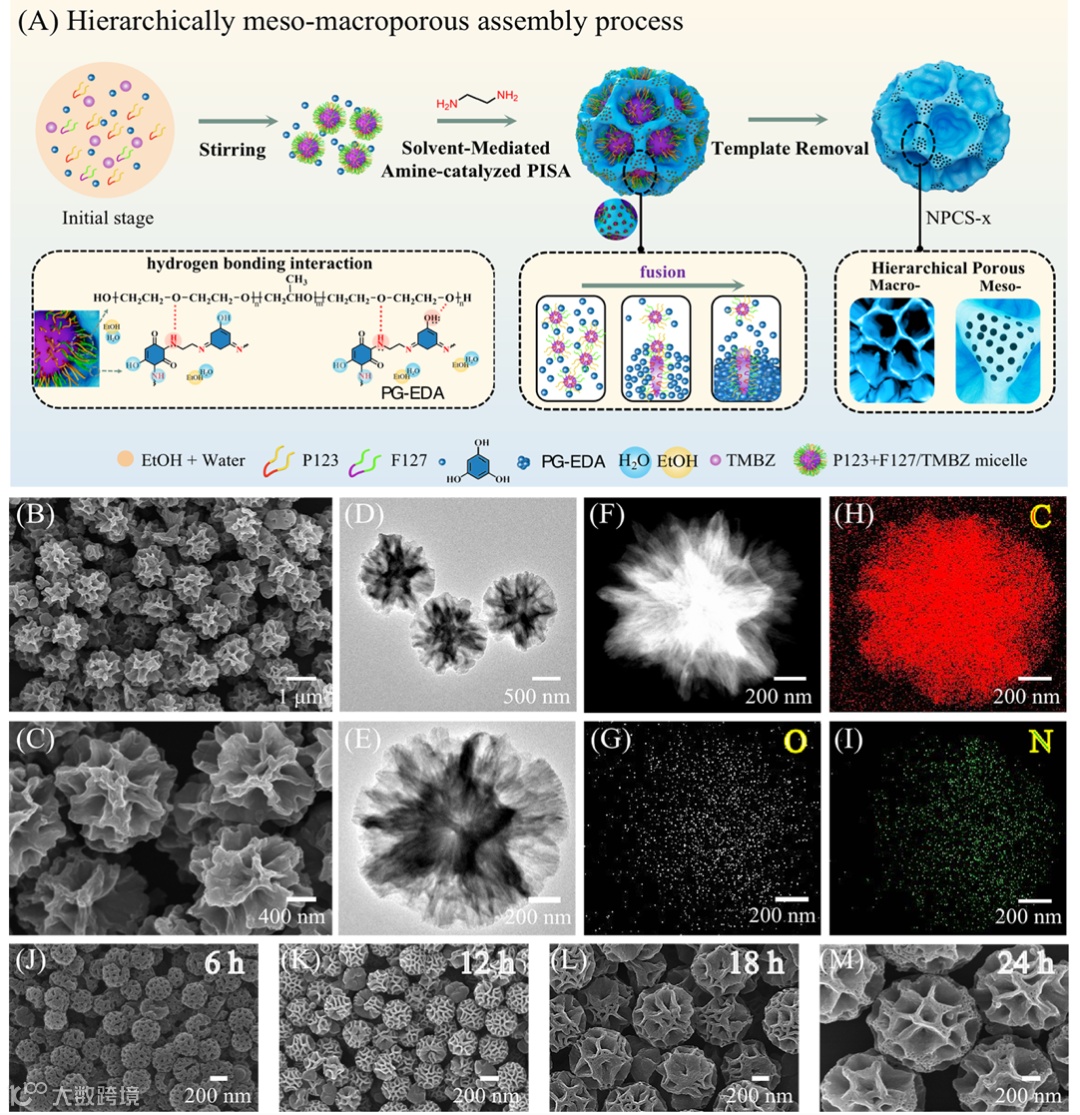 图一 (A)N掺杂多级介孔-大孔碳球(NPCS-x)组装过程,(B,C)NPCS-40的SEM图和(D,E)TEM图,(F-I)NPCS-40的HAADF图和元素分布图,(J-M)NPCS-40 组装过程的SEM图