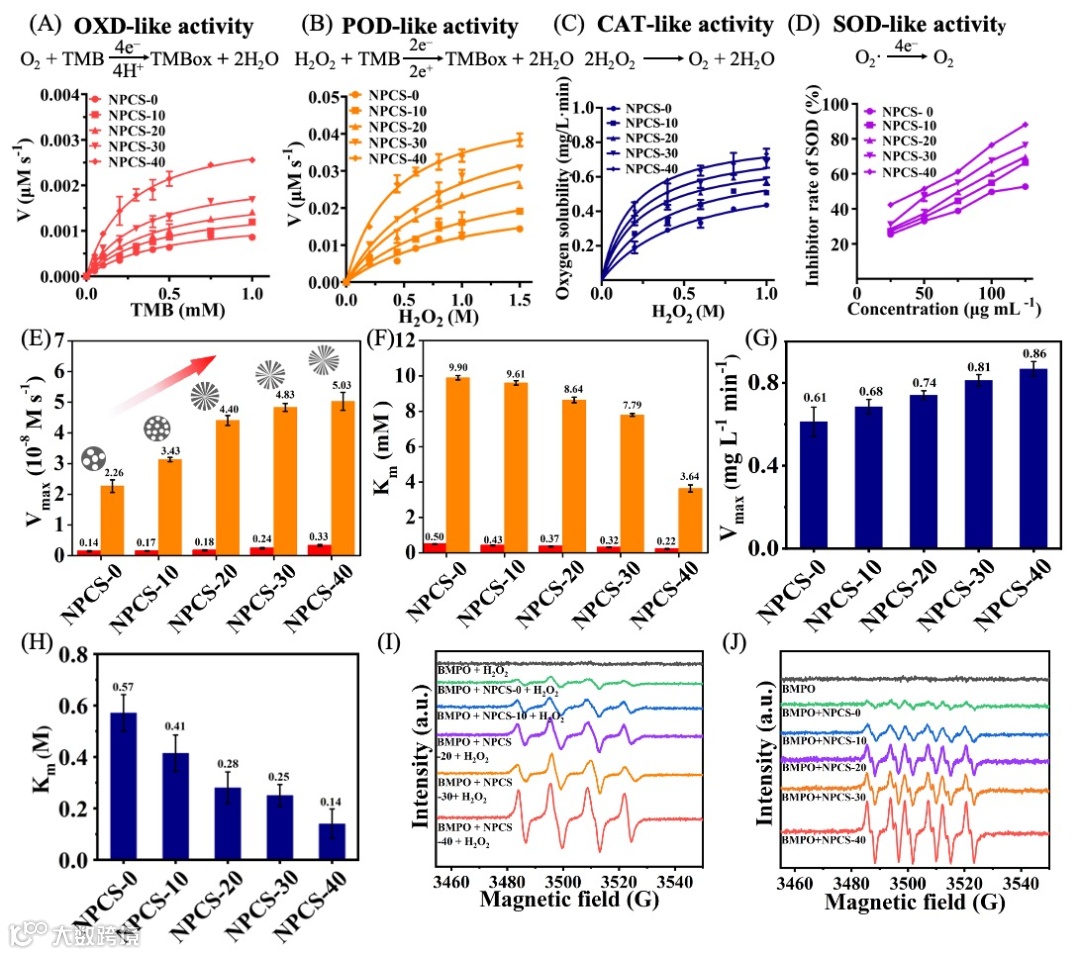 图四(A-D)分别为NPCS-x的类氧化酶(OXD)、类过氧化物酶(POD)、类过氧化氢酶(CAT)和类超氧化物歧化酶(SOD)活性动力学曲线,(E,F)分别为NPCS-x的类OXD(红色)和类POD(橙色)的VMax和Km,(G,H)在类OXD催化中的超氧自由基和POD催化中的羟基自由基EPR图