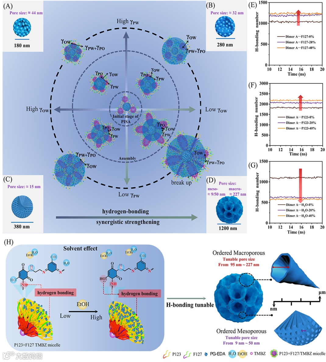 图三(A-E)二元溶剂体系对孔结构的调控机理,(E-G)分子动力学(MD)模拟不同溶剂体系中的二聚体与三嵌段共聚物F123、P123和水分子之间氢键数目,(H)溶剂对介孔-大孔的调控机理