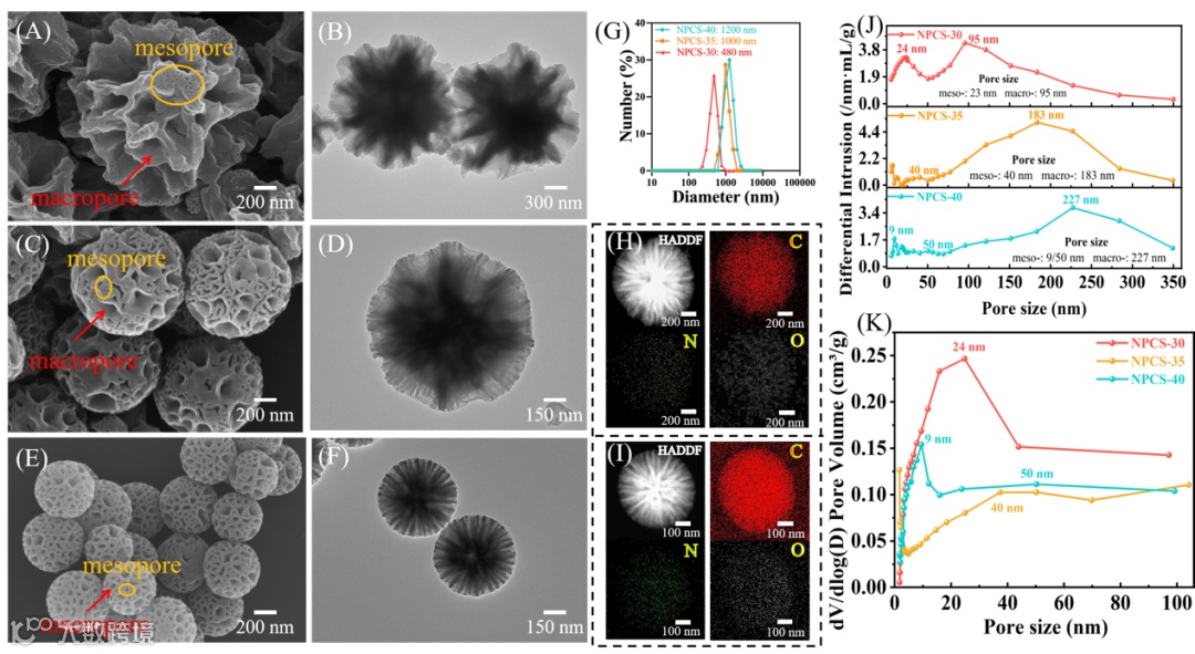 图二 (A,C,E)分别为NPCS-40,NPCS-35,NPCS-3的SEM图和(B,D,F)TEM图,(G)粒径分布图,(H,I)分别为NPCS-x的HADDF和元素分布图,(J)材料的压汞仪和BET测出的孔径分布图
