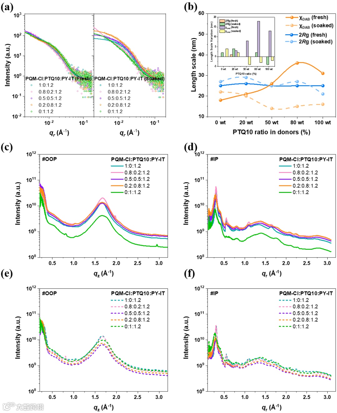 在这里,选择 PQM-Cl:PY-IT 和 PTQ10:PY-IT 两个亲本二元全聚合物体系来构建高性能三元共混物。由于系统地提高了开路电压 (VOC)、短路电流密度 ( JSC)和填充因子(FF),随着薄膜的延展性同步上升。更重要的是,与其他组件比的对应物相比,优化后的三元all PSC 在最大功率点 (MPP) 跟踪下获得了显着增强的器件运行稳定性,这主要是由于“burn-in”退化的缓解。基于这种组分比例的变化,研究者制做了活性层在 N2 手套箱中 1 太阳光照下活性层退化 10 小时的器件,结果进一步支持了最佳三元混合物中的“burn-in”损失最小化。形貌学表征在强光应力后最佳三元薄膜中呈现出良好的相分离,而其他系统则偏离其自身的初始状态。至于结晶行为,正面取向和 π-π 堆叠排序在最佳三元混合物中也得到了最好的保持。考虑到所有其他体系的参数,PTQ10 的形貌降解方向与 PQM-Cl 的相反,这可能在混合比为 0.8:0.2:1.2 时实现所需的平衡。此外,光物理实验揭示了从 PTQ10 到 PQM-Cl 的电荷转移途径,它还充当额外的电荷产生通道,保护了供体混合物中的 PQM-Cl 电荷产生特征,以及在最佳三元系统中保持良好的空穴转移动力学PQM-Cl:PY-IT 和 PTQ10:PY-IT 二元薄膜中相反变化方向导致的光吸收相互抵消。这项工作清楚地提出了合理的三元设计的意义,以通过全面的形态和物理研究支持提高器件稳定性,推动构建具有良好性j能参数的全 PSC 的前景。