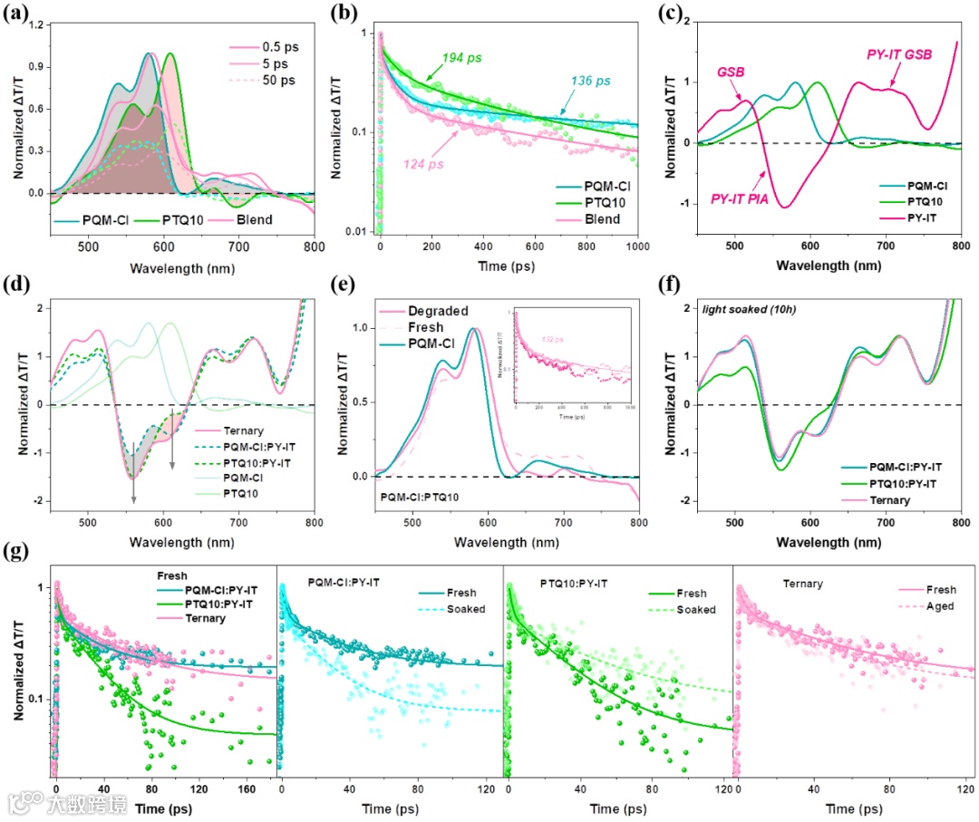 综上所述,他们在此关注all-PSC最受关注的话题,如三元器件设计、光稳定性和底层机制。与基于 PQM-Cl:PY-IT 和 PTQ10:PY-IT 的二元全 PSC 相比,基于 PQM-Cl:PTQ10:PY-IT (0.8:0.2:1.2) 的三元全 PSC 同时实现了更高的 PCE 、薄膜延展性和器件稳定性。器件寿命延长是通过减轻老化损耗实现的,因此通过比较新鲜薄膜和光降解薄膜,在 PCE、形态特征和激子行为方面进一步了解工作。然后发现 PQM-Cl 和 PTQ10 表现出相反的形态演变趋势,幸运的是在混合时达到平衡,从而使纯和混合的相长度尺度保持良好。这种抵消策略也成功地保持了电荷转移动力学。因此,这项工作揭示了精细三元混合设计的潜在物理和形态机制,能够减少高效稳定all PSC 的“burn-in”损失。