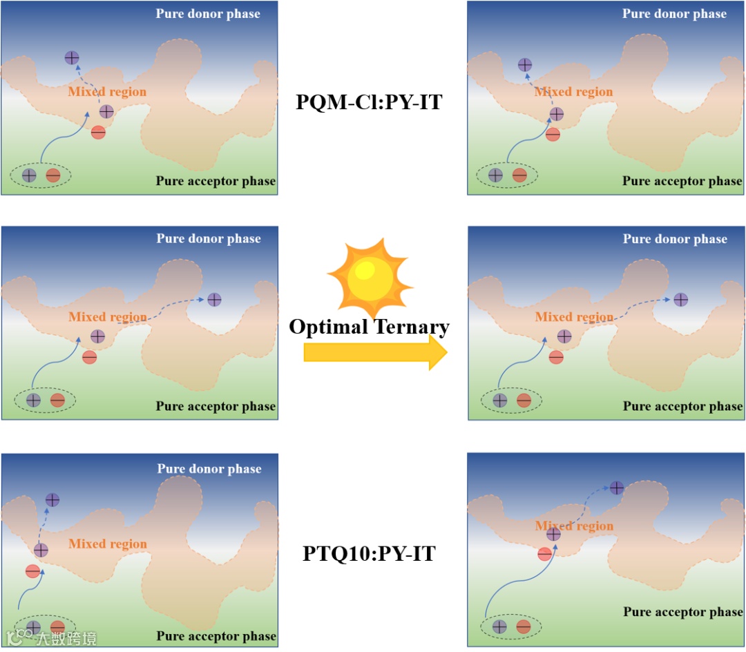 在稳定性增强方面,最有效的方法之一是减少形态和OPV器件的老化损失。除了陷阱辅助重组增加的广泛认可机制外,形态退化(尤其是供体和受体的混合或去混合)也被发现是一个重要因素。由于这两种进化行为都可能导致显着的老化损失,因此找到一个平衡点以最小化不需要的形态退化应该是一个不错的选择。因此,混合两种具有不同相演化方向的高效二元供体-受体系统有望成为一种合理实用的三元策略,以获得高效稳定的 OPV 器件。此外,将all-PSCs的器件性能、有源层形貌和物理参数关联起来有利于理解稳定性变化,但尚未引起足够重视。