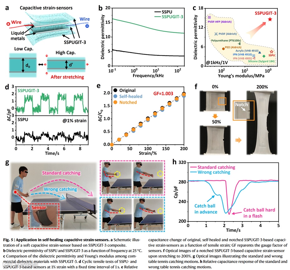 同时,液态金属颗粒还可以极大提高柔性聚脲的介电性能并保证了材料的柔性,这种低模量-高介电常数的性能组合使得仿生复合材料可用于开发可拉伸电容传感器。开发的柔性电容传感器不仅拥有更低的检测下限,同时具有高断裂韧性和光控修复性能。基于上述特性,该柔性传感器可用于检测乒乓球训练中的运动员的击球是否符合要求帮助纠正运动员错误的接球动作。