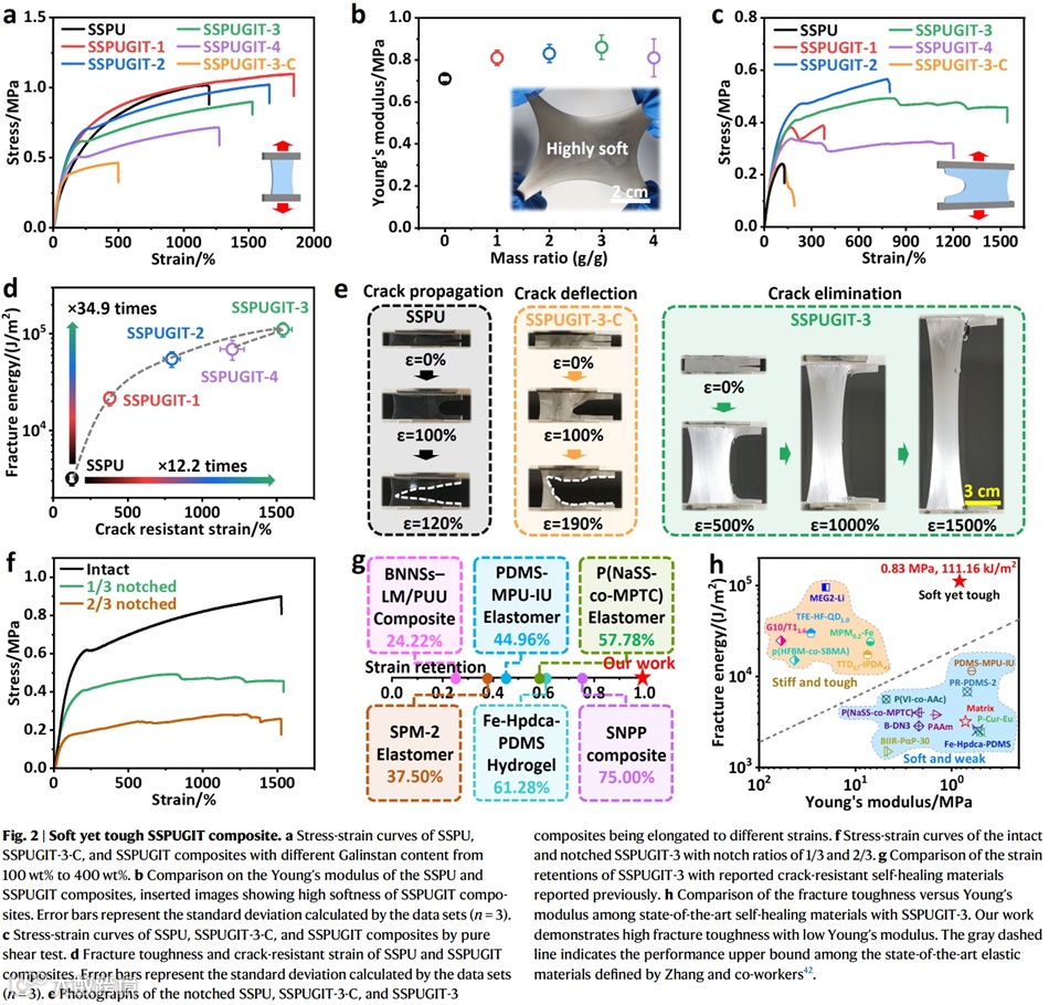 类似于平滑肌细胞,当该仿生材料遭受损伤时,金属氧化物外壳的破裂及氧化外壳与聚氨酯的配位作用的破坏均能带来机械能耗散,而液态内核能够使应变过程中裂纹偏转并最终消除垂直于应变方向的裂纹,从而赋予材料优异的抗撕裂性能和断裂韧性。基于这种独特的结构设计,能够突破理论极限,使得柔性聚脲的断裂能提高到34.9倍,达到111.16 kJ m-2,临界断裂应变提高到12.2倍。值得注意的是,受到不同程度损伤的SSPUGIT甚至能维持与完好样品相同的断裂应变,这在柔性材料中是极为罕见的。