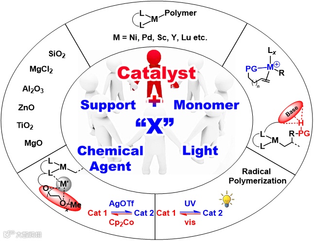 在“Catalyst + X”策略中,催化剂与反应体系中的其他组分“X”的相互作用,例如载体、单体、溶剂、化学试剂和光等,可以有效地调节催化性质,并实现催化剂的高性能化。因此,无需设计和合成新的催化剂分子结构,就可以提高催化性能。本综述总结了这些“Catalyst + X”策略的一些最新进展。