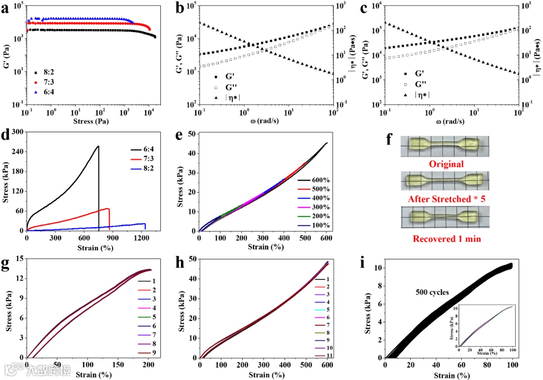 该双网络离子液体凝胶展现出良好的力学性能(图4)。流变学测试表明该类凝胶具有较高的机械强度和良好的黏弹性,是一类典型的弹性占主导的类固体凝胶材料;拉伸和压缩测试进一步证实了双网络结构对凝胶力学性质的提升效果。循环加载-卸载曲线中较小的滞后圈表明凝胶具有优异的回弹性,这是由于保存完整的网络结构所致。当受到外力作用时,尽管网络结构中的部分交联点会被破坏,但体系中大量存在的动态共价键和非共价键可以充当临时交联点以维持微观网络结构的完整性,因此凝胶表现出突出的回弹性。500次连续循环拉伸实验表明凝胶具有显著的抗疲劳性能和机械稳定性。