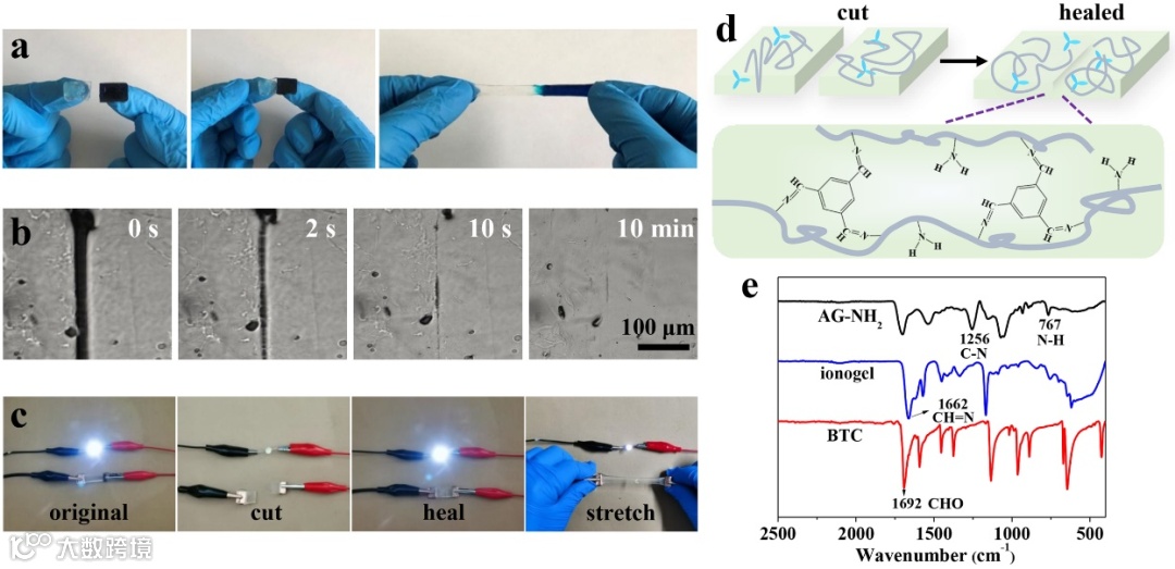 凝胶网络中的氨基化琼脂糖和均苯三甲醛可以通过席夫碱反应生成动态可逆的亚胺键,赋予该离子液体凝胶高效的自愈合能力(图3)。当离子液体凝胶受到外力破损后,可以在环境条件下进行快速自我修复,于几分钟内实现“伤口”的愈合。作者从宏观和微观角度证实了其自愈合的机制。
