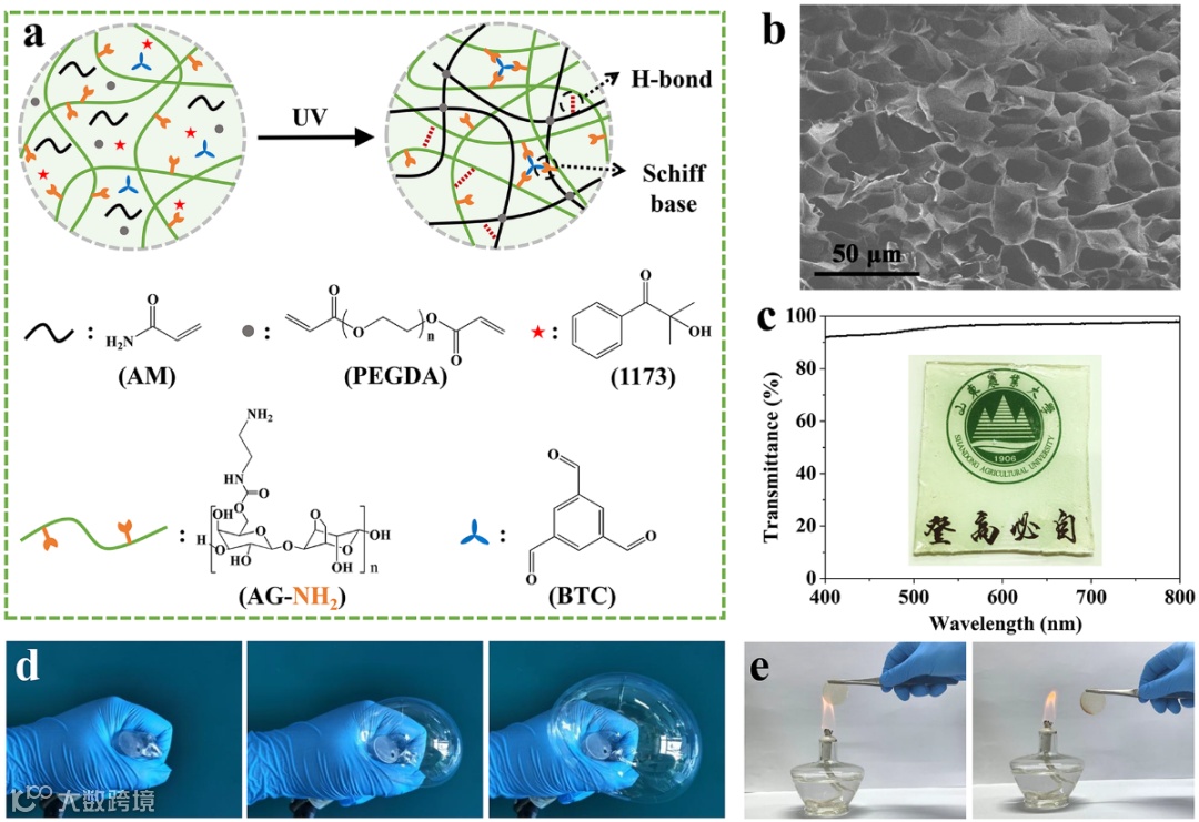 基于此,山东农业大学王晓琳课题组利用多功能离子液体凝胶开发了一种优异的柔性离子传感器。该工作中的离子液体凝胶由共价交联的聚合物网络及动态共价交联的天然多糖生物分子网络组成(图1),展现出超高的透明度、阻燃性、强黏附、宽温度窗口、高回弹以及长久的机械稳定性等综合性能;从动态建构化学出发对分子功能改性所引入的动态亚胺键,赋予凝胶自修复能力,可在几分钟内从分子水平实现“伤口”的快速愈合;独特的凝胶诱导荧光发射使其在诸多柔性传感器中脱颖而出。相关工作以“Fluorescent double network ionogels with fast self-healability and high resilience for reliable human motion detection”为题发表在期刊《Materials Horizons》上,硕士研究生赵相杰为论文第一作者,王晓琳副教授为论文的通讯作者。该工作得到了国家自然科学基金和山东省自然科学基金的资助。
