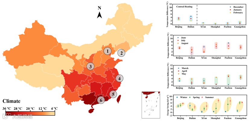 研究团队通过多个城市、不同季节的室内模拟测试,证实了该智能窗户具有室内温度调节能力和建筑节能效果。选取北京、大连、西安、上海、福州和广州作为代表性的试点城市,跨越北纬23 °N 到40 °N,覆盖了亚热带、温带、沿海、内陆等不同地理和气候特点,从2021年12月到2022年8月,进行了为期九个月的室内模拟测试(图3)。在北方,模拟冬季供暖条件,利用智能窗户的热致变色效应,有效地降低了室内热量的辐射逃逸,表现出优异的建筑节能效果(4.04-4.30 kJ m-3)。在春季,广州的智能窗户可将室内温度降低4.0 °C左右,并节能5.14 kJ m-3。在夏季,随着气温进一步升高,智能窗户在所有城市均展现优异的温度调节能力(最高可达7.3 °C),其建筑节能效率可达9.51 kJ m-3。