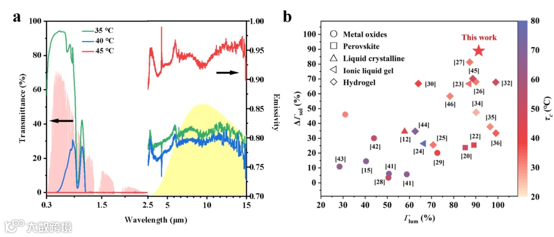 利用一系列P(PNIPAM-DMAA)水凝胶制作智能窗户,实现了环境温度响应的阳光调节:当环境温度高于LCST时,智能窗户变得不透明,在全波段范围内阻隔太阳光照射(图2a),有效地减弱了可见光和红外热辐射,避免室内温度过高,调节能力可达88.84%,实现了调节能力的突破(图2b)。