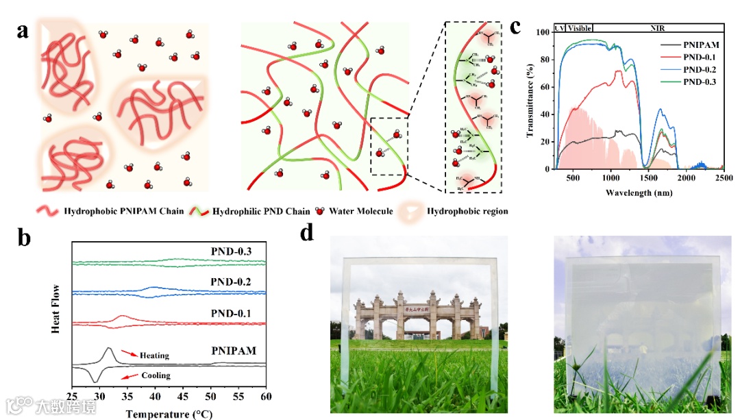 中山大学付俊教授团队和福州大学江献财副教授团队合作开发了一种能够满足不同气候条件需要的热致变色水凝胶智能窗户,通过连续调节水凝胶的相转变温度,实现了不同纬度地区、不同季节的室内温度调节。聚N-异丙基丙烯酰胺(PNIPAM)是著名的LCST(低临界共溶温度)型聚合物。当温度升至LCST(约32.5℃)以上时,PNIPAM水凝胶会由透明态转变为不透明态。利用这一特性,研究团队通过引入亲水性单体N, N二甲基丙烯酰胺(DMAA),与NIPAM共聚(图1a),在32.5 °C-43.5 °C范围内实现了对LCST的连续调控(图1b)。当温度低于其LCST时,P(NIPAM-DMAA)共聚物水凝胶透明度极高,全波段的光透过率大于91.30%(图1c),在LCST以上温度则不透明(图1d)。