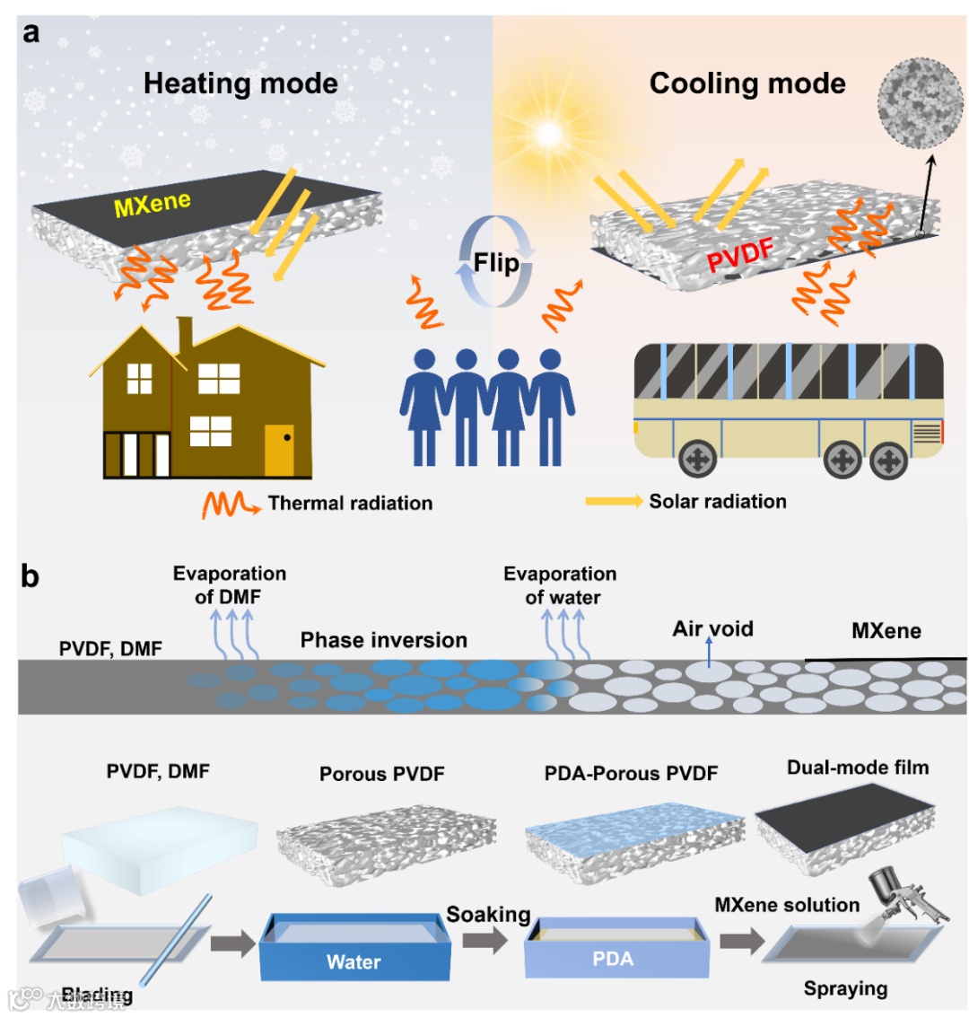 图1.双模式辐射制冷/加热复合薄膜原理及制备示意图