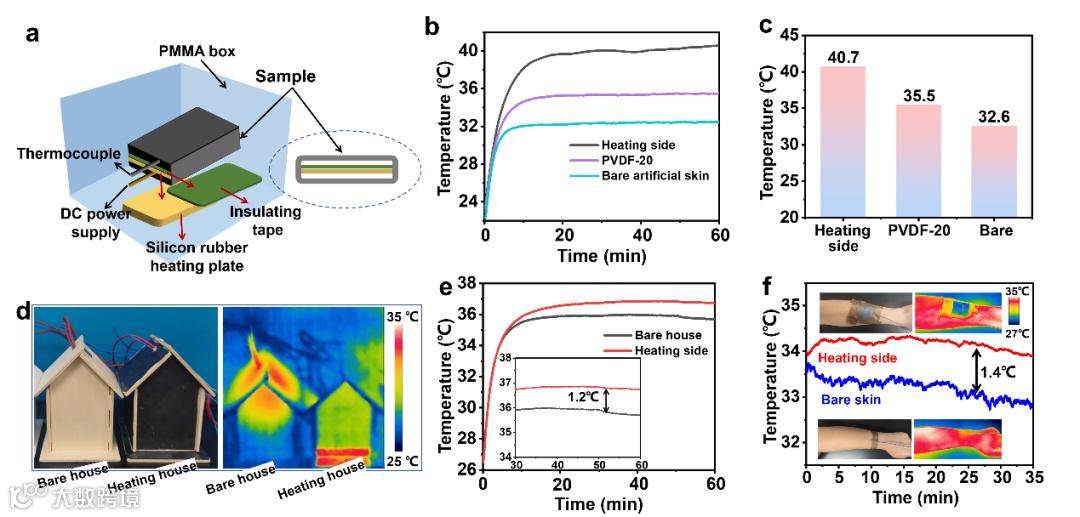 在加热模式下,通过与纯PVDF薄膜和裸露人工皮肤对比,双模式薄膜加热侧的辐射加热温度达到了40.7℃,分别比多孔PVDF薄膜和人工皮肤高了5.2℃和8.1℃。覆盖双模式薄膜的房屋模型内实际温度比裸露房屋1.2℃,覆盖双模式薄膜的人体手臂温度比裸皮肤温度高1.4℃。