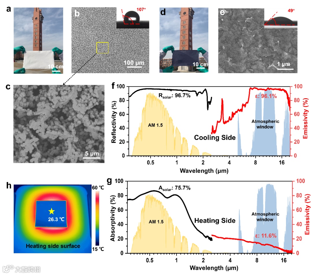 图2.双模式薄膜制冷侧和加热侧的形貌和紫外-红外吸收率/发射率