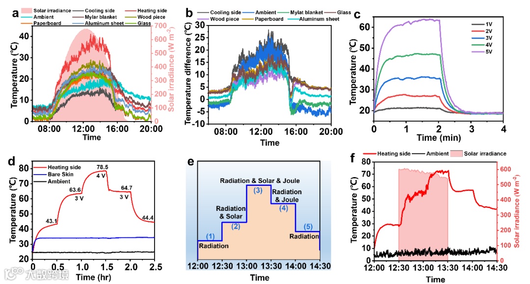 同时,双模式薄膜加热侧由于具有较高太阳吸收率、低红外发射率和高电导率而表现出优异的太阳光加热和焦耳加热性能。在光热实验中,与其他常见材料相比,双模式薄膜加热侧的太阳光加热温度最高达到41.2℃,明显高于其他材料。此外,施加安全电压后,双模式薄膜可被迅速加热并达到稳定的温度。室内外进行的多模式结合加热实验结果表明,被动辐射加热、光热和电热三种加热模式可进行自由切换。
