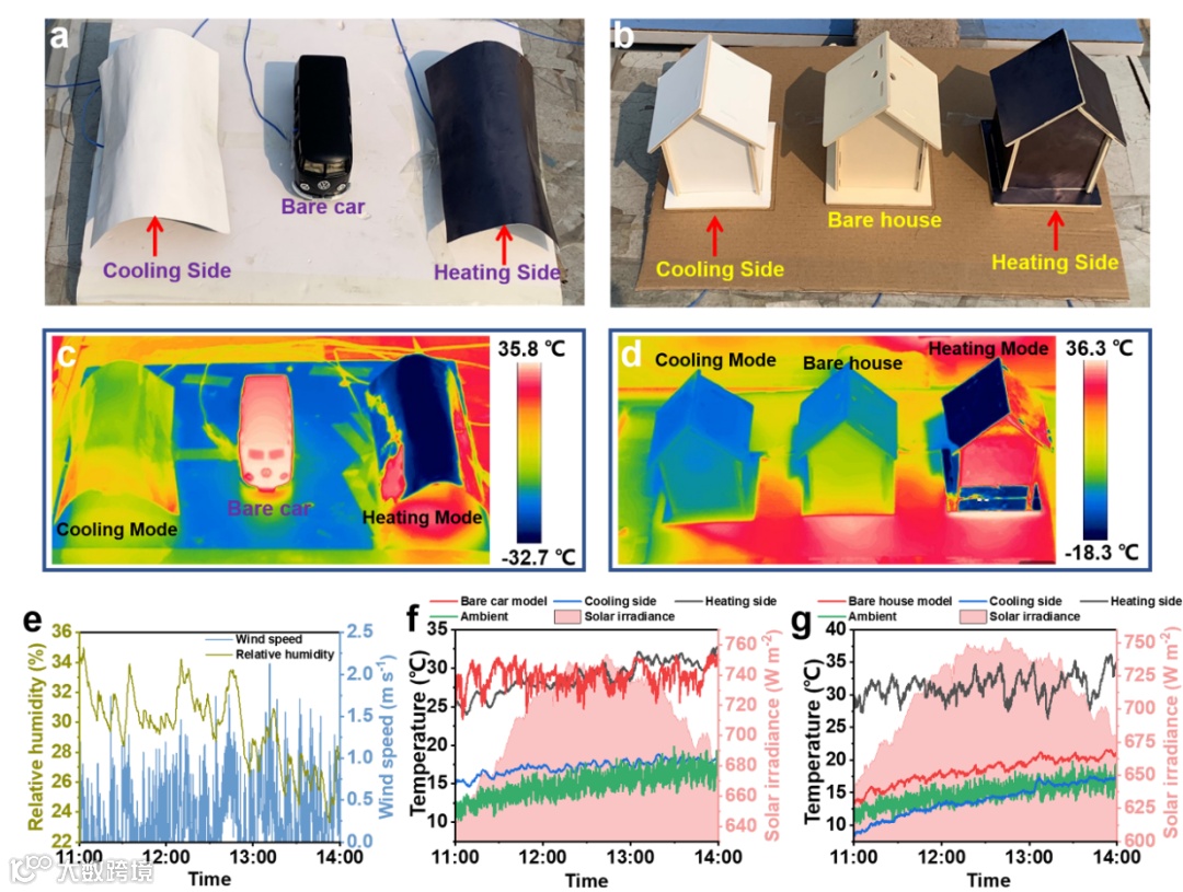 作者将双模式薄膜的制冷侧和加热侧分别覆盖在汽车和房屋模型上,研究了室外双模式薄膜在实物上的实际制冷和加热能力。结果表明,在太阳辐照度为600 W/m2时,制冷侧面覆盖的汽车内部平均温度为17.2℃,明显低于裸车(29.0℃),显示了薄膜的实际制冷能力。制冷侧覆盖的房屋模型内部平均温度为13.9℃,而裸房模型的内部平均温度为18.4℃,同时,被加热面覆盖的房屋模型内部温度为31.3℃,双模式薄膜可同时实现4.5℃的制冷能力和12.9℃的加热能力。以上实验结果表明,通过翻转双模式薄膜可实现辐射制冷和加热模式的动态转换,在空间/个人/建筑制冷和加热等实际热管理场景中具有很大的应用潜力。