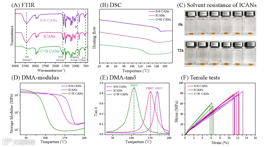 图2 ICANs,S-S CANs 和 C=N CANs的本体性能:(A)FTIR;(B)DSC;(C)耐溶剂性;(D)DMA-modulus;(E)DMA-tan(δ);(F)拉伸性能。