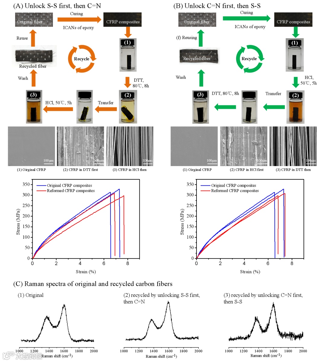 图4 基于ICANs的CFRP复合材料的互锁和再循环特性:(A)通过首先解锁二硫键,然后解锁亚胺键进行再循环;(B)通过首先解开亚胺键,然后解开二硫键进行再循环。(C)初始和再回收后碳纤维的拉曼光谱。
