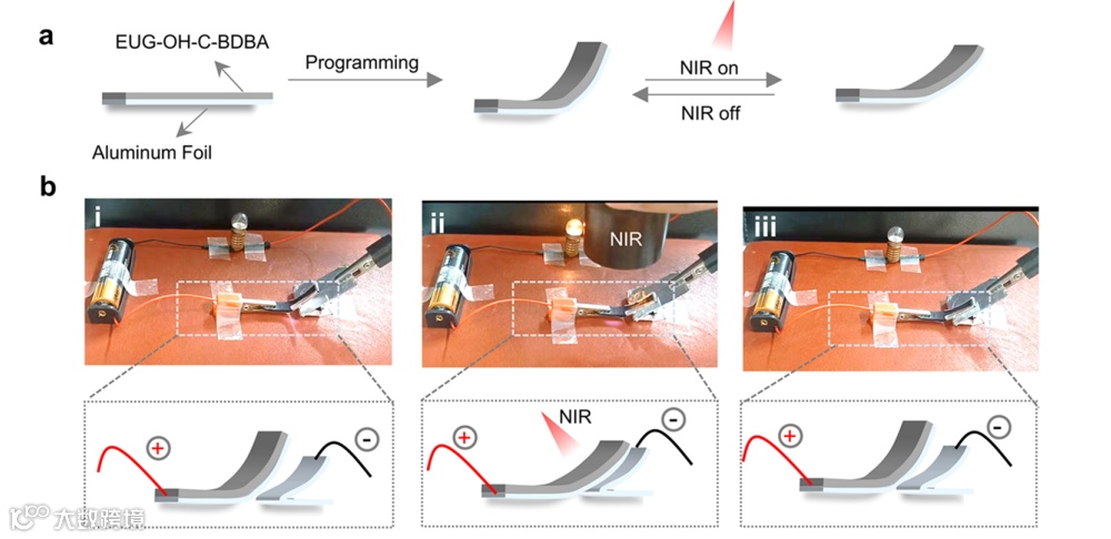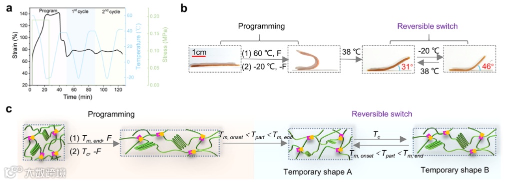 形状记忆高分子材料(SMPs)是一类能够固定临时形状,并在相应激发下回复原始永久形状的智能材料,可被应用于生物医用、汽车工业、智能织物、航空航天等众多领域。然后,传统的SMPs一般通过共价键交联,不具备永久形状重构、自修复、重复加工等性能。同时,传统SMPs每个形状记忆周期只能完成一次形状回复,形状记忆单向不可逆。为了突破共价键交联网络带来的性能局限性,常见的方法是引入动态键,构建热自适应网络结构。为了解决形状记忆单向不可逆问题,近年来又发展出双向形状记忆高分子。虽然有关热自适应网络结构和双向形状记忆高分子的研究已分别取得一些列重要进展,但将两者结合制备兼具自修复、可回收、永久形状可重构、形状记忆双向可逆性能的多功能SMPs仍然具有挑战。