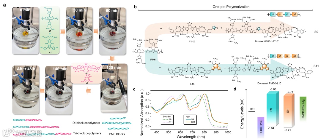 图1 (a)一锅连续共聚策略示意图;(b)S9和S11的化学结构;(c)S9和S11在氯仿溶液和薄膜中的紫外-可见吸收光谱;(d)多组分体系和电极的能级示意图。