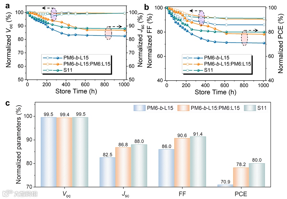 为进一步证实这一假设,作者在嵌段共聚物PM6-b-L15中引入少量聚合物PM6(2%)和L15(5%)作为具有精确组成和结构的多组分活性层来制备有机光伏器件。经过1000 h的加速热老化后,三元体系PM6-b-L15:PM6:L15的稳定性结果与该连续共聚策略制备的S11体系相当(78% vs 80%,图4)。这些发现为开发低成本且长期稳定的有机光伏电池提供了重要的理论和实验依据。该技术结合喷涂、刮涂等大面积器件加工工程技术将有助于实现有机光伏电池的规模化生产。