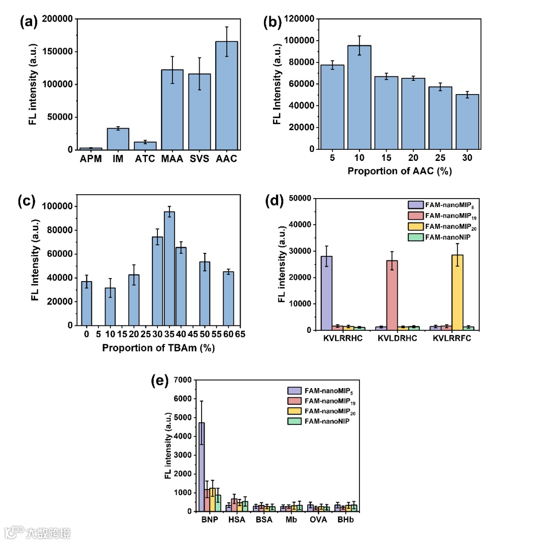 图3. (a-c)通过使用磁性模板和荧光FAM单体的竞争荧光分析对MIP合成配方进行组合筛选;(d-e)纳米颗粒对干扰肽、BNP和干扰蛋白(HSA、BSA、Mb、OVA和BHb)的结合特异性。