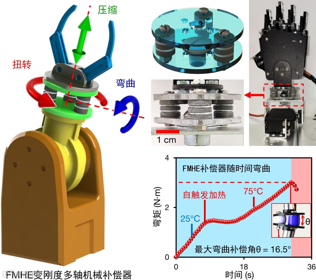 利用FMHE的自触发变刚度特性,本工作开发了一种可用于机械臂关节的变刚度多轴柔度补偿器。这种装置可以通过变形为机械臂提供位置和角度误差补偿,从而避免在涉及复杂接触的场景或未知操作环境中由于磕碰损坏电机和设备。这对柔性机器人的操作至关重要。如图5所示,FMHE多轴补偿器主要由三个由5V直流电源供电的FMHE圆柱组成,可以实现可调节刚度的压缩、弯曲和扭转运动。当关节变形达到预设幅度时FM熔化,从而触发补偿器减小刚度以进一步增加补偿量。与当前最先进的商业橡胶补偿器相比(例如Schunk® FUS补偿器,可弯曲1.1°),FMHE补偿器的弯曲补偿能力提升了一个量级(可弯曲16.5°)。