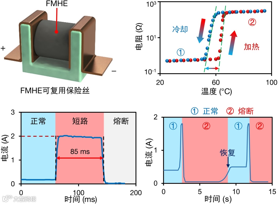 基于这种材料,本工作还展示了一种可重复使用的限流低温保险丝,其主体为嵌在贴有电极的凹槽中被预压缩的FMHE块(图6)。保险丝在升温-降温循环中的电阻变化如图所示,在从室温加热至66℃时其电阻可增加1000倍。通过调节FMHE的压缩量,保险丝可实现0.1 ~ 10 A的可调节熔断电流。当电路电流达到预设的熔断电流后,保险丝可在0.1秒内被加热以切断电路,并在10秒内自动恢复至可用状态。循环测试显示了FMHE自恢复保险丝的快速响应和恢复速度以及出色的循环稳定性。与商用可复用保险丝相比,它具有更紧凑的结构(<1 mm),更低的熔断温度(66℃),以及更快的熔断和恢复速度。这种可响应环境变化的智能材料实现了可调节电气和机械性能的协同利用,充分展现了它为下一代软体机器人和电子设备带来革命性改变的潜力。