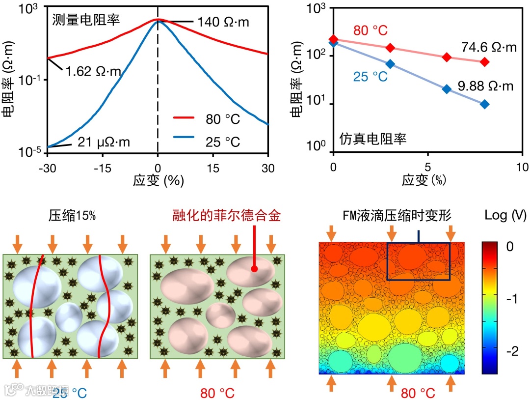 当被加热至60℃以上时,材料中的FM颗粒融化。熔化的FM液滴不能像固体FM颗粒一样互相接触以形成导电路径,而是在载荷下随聚合物基质变形。这显著降低了复合材料的导电性和应变灵敏度(图2)。有限元仿真和显微镜观测结果均证实了这一假设。