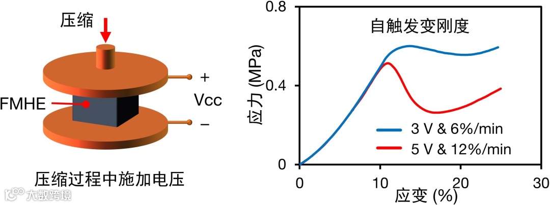 利用材料在变形时电阻显著降低这一特点,通过在复合材料上施加低电压,其可以在压缩过程中被电加热以融化FM颗粒,从而实现由变形量触发的自响应刚度调节。这一功能创新性地结合了FMHE的可变电阻/刚度特性,是此前的研究中未曾实现的。如图4给出的变刚度应力应变曲线所示,刚度变化的触发应变可以通过电压和压缩速度来调节,增加电压可以降低材料软化所需的变形量。