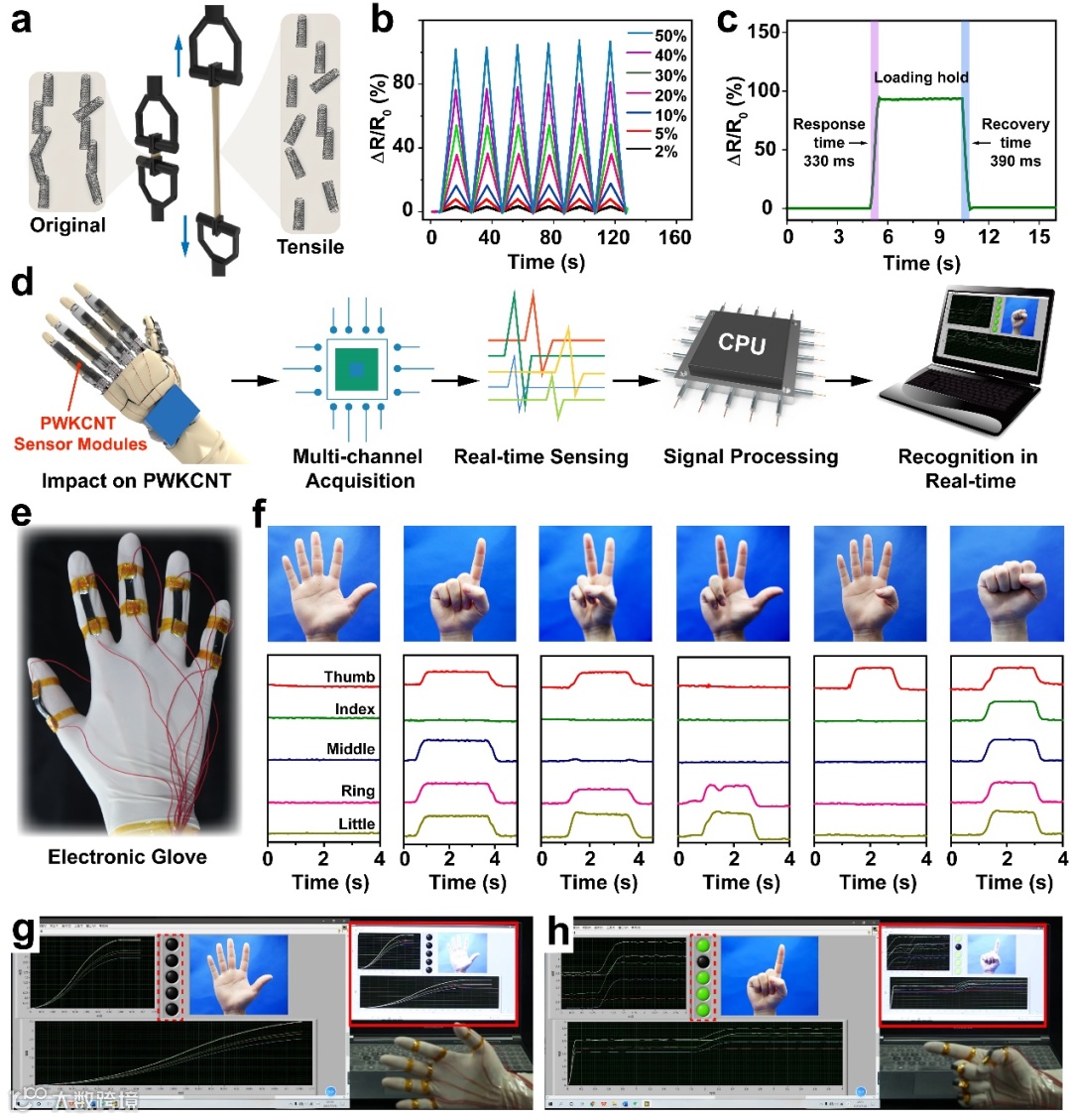 更重要的是,羊毛角蛋白还可以作为连接碳纳米管与聚丙烯酰胺链的天然介质,增加了碳纳米管在聚合物网络中的分散性,从而得到具有优异机械和电气性能的应变传感器。凭借舒适且柔软的构造,这些羊毛角蛋白衍生的传感单元可以进一步组装成一个集成手套,并且用于实时手势识别(图3)和灵巧的机械臂操作(图4),表明羊毛角蛋白衍生的复合材料在可穿戴人工智能方面的巨大潜力。该工作以“Using Wool Keratin as a Structural Biomaterial and Natural Mediator to Fabricate Biocompatible and Robust Bioelectronic Platforms” 为题发表在《Advanced Science》上(DOI:10.1002/advs.202207400)。文章第一作者是厦门大学博士朱水洪。感谢国家自然科学基金、福建省“雏鹰计划”青年拔尖人才项目、福建省科技厅杰出青年基金、中央高校基本科研业务费及111计划的支持。同时感谢厦门大学吴晨旭教授、吴建洋教授、林昶旭副教授在理论模拟和机械臂操纵技术等方面的支持。