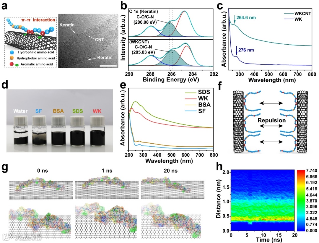 图2.羊毛角蛋白制备导电生物墨水。实验与理论结果证明羊毛角蛋白对碳纳米管具有极强的分散性能。