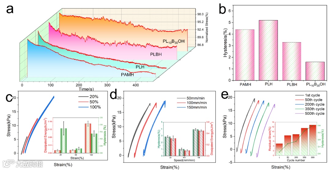 在450 s的观测时间内,100%应变下的PLBOH有机凝胶的应力松弛仅下降了约8%,其对应的滞后为1.38%,展示出了优异的低滞后性能。另外,在不同拉伸应变和拉伸速率条件下对有机凝胶进行了滞后性能测试,PLBOH有机凝胶在不同测试条件下均表现出较低的滞后性能与较低的能量耗散,另外在500次循环之后其滞后仍能保持较低水平(<3.6%)(图2)。该研究表明溶胀和乙二醇的润滑作用可以有效降低有机凝胶的滞后性能。