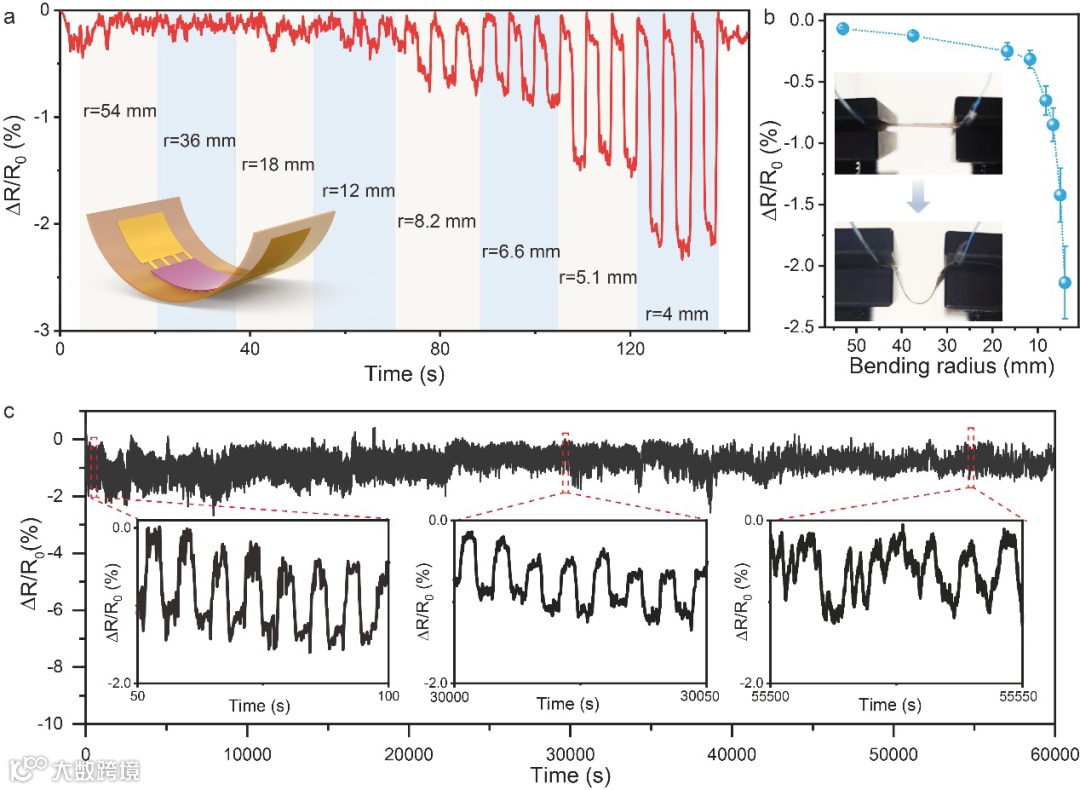该方法首先制备了超薄聚酰亚胺柔性衬底及可用于喷墨打印的水性前驱体墨水,通过调控墨水组分、溶剂比例,对MoS2前驱体墨水的表面张力、粘度和密度进行优化与调控,制备的前驱体墨水能够实现稳定喷射,并且通过调控前驱体的浓度,可以得到不同厚度的前驱体薄膜,基于此在聚酰亚胺衬底表面喷墨打印了敏感单元。之后引入氩气保护,在氢气辅助下实现了前驱体在较低温度(350 °C)的热分解与原位结晶,获得了图案化的MoS2结晶薄膜(图1),通过高分辨透射电镜,进一步确认所得MoS2由单晶组成的多晶相,其晶粒尺寸在10-20 nm之间,优于类似温度合成的MoS2膜。此外,得益于超薄的MoS2及和聚酰亚胺衬底之间的强粘附力,该MoS2图案具有极佳的力学稳定性(曲率半径4 mm时,电阻变化率<2%)、耐久性(>10000次弯折)以及化学稳定性(耐丙酮、二甲基甲酰胺、紫外线等)(图2)。