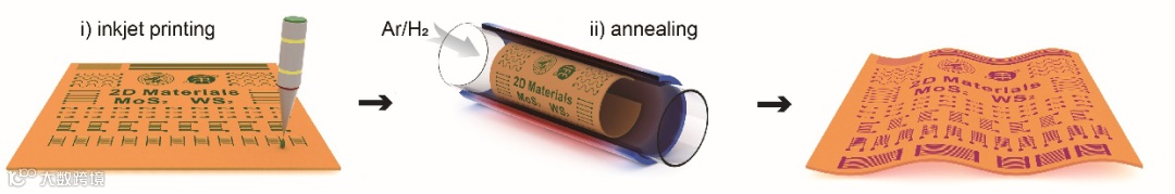 图1喷墨打印和退火工艺相结合实现在聚酰亚胺表面直接生长MoS2图案。