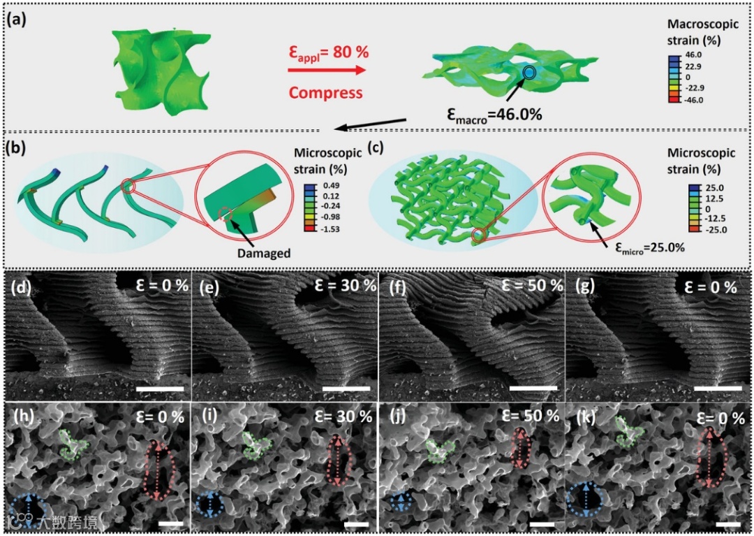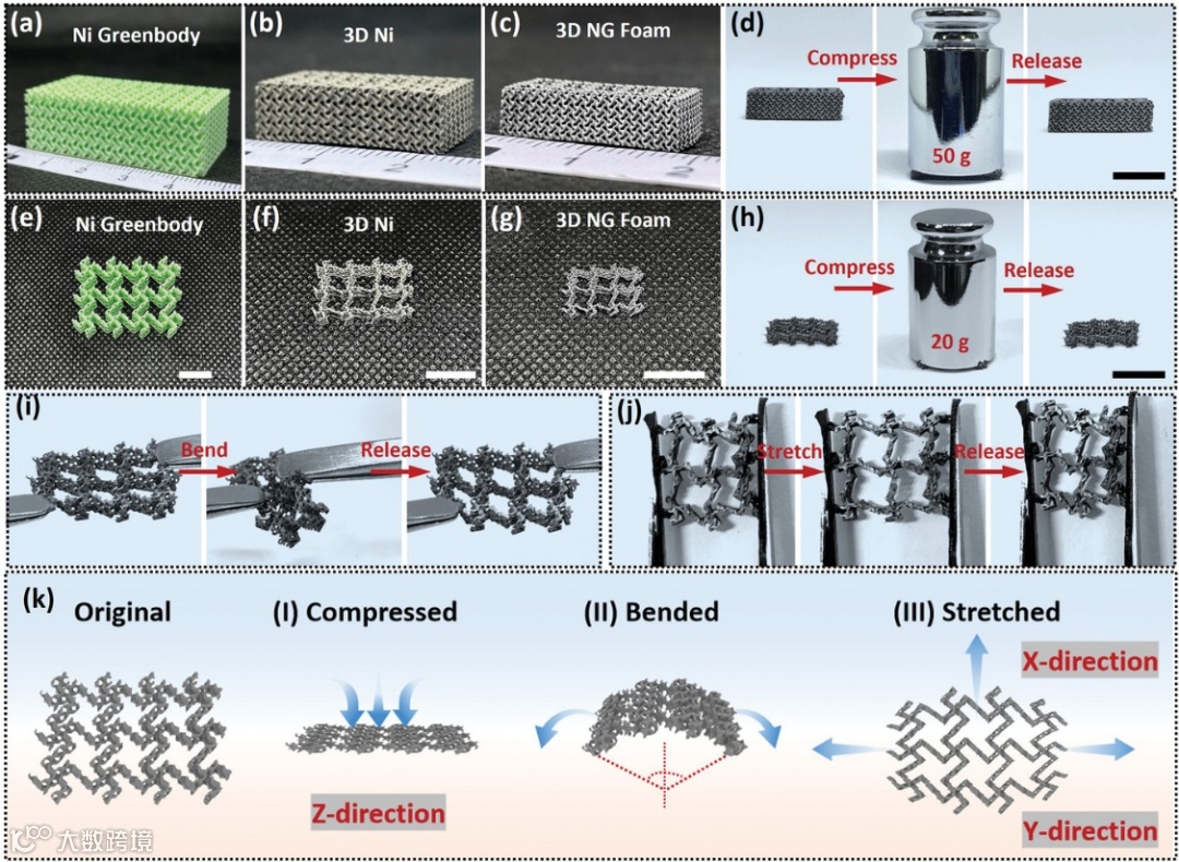 图4. 三维NG泡沫的分级有限元模拟与力学性能。a-c) 3D NG泡沫和传统石墨烯泡沫在相同宏观应变下的微观应变分布图比较。d-g) 不同压缩程度的NG泡沫宏观结构的原位SEM图像。h-k) 不同压缩程度的NG泡沫微观结构的原位SEM图像。