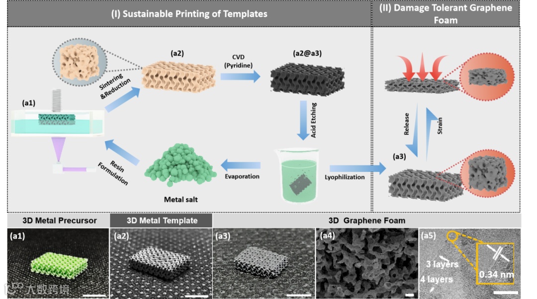 图1. 三维金属模板和三维NG泡沫制备示意图和表征。I-II) 制备工艺示意图。a1) 三维镍盐模板,a2) 三维镍模板和a3) 相应NG泡沫的照片。a4) 三维NG泡沫的SEM图像。a5) NG泡沫的HRTEM图像。