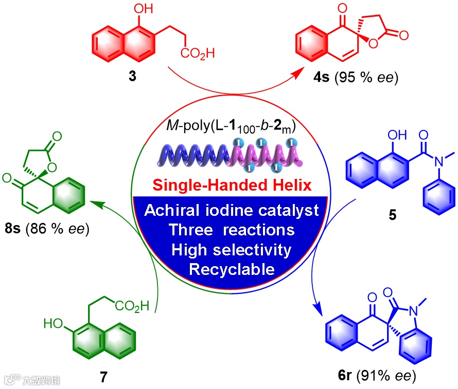 图2. 非手性碘负载单手性螺旋聚异腈催化去芳构化氧化反应