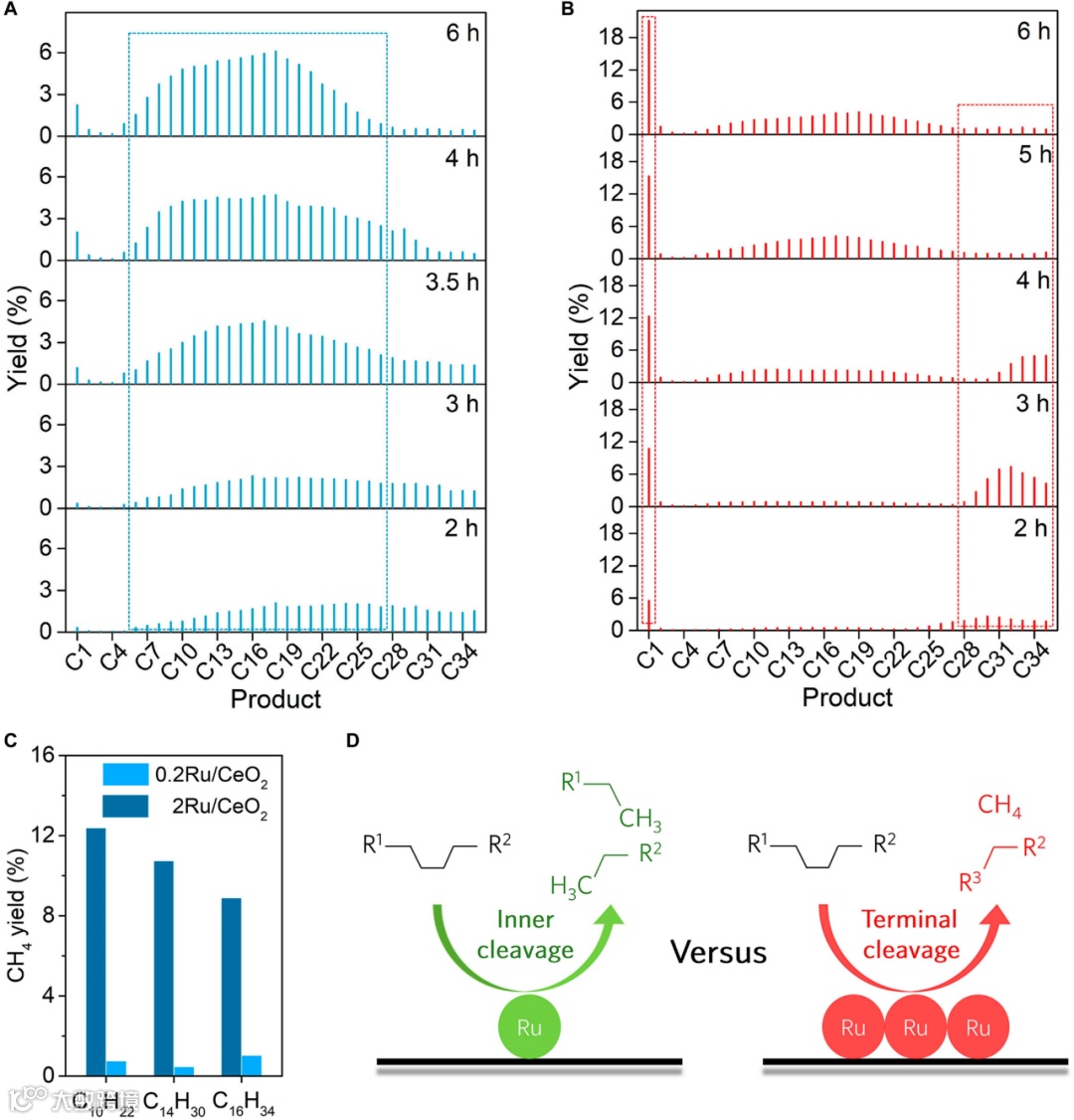 近年来,聚烯烃氢解技术受到了广泛的关注和研究,该技术可以在温和的反应条件下将废弃聚烯烃转化为高附加值的液体燃料。钌(Ru)基催化剂在该体系中具有高效的催化性能,然而,传统的Ru纳米颗粒催化剂上会产生严重的甲烷化(常高于20%),低价值的甲烷降低了回收效益,限制该技术的工业化进程。氢解过程中的甲烷化主要是由端基C−C键的裂解以及聚合物吸附在多Ru位点上的碎片化过程引起的。消除聚烯烃链在多位点Ru催化剂上的吸附或降低内部碳链裂解的能垒,有望抑制甲烷化反应。因此,设计高活性、高稳定性以及高选择性的Ru基催化剂,对聚烯烃的氢解化学回收至关重要。