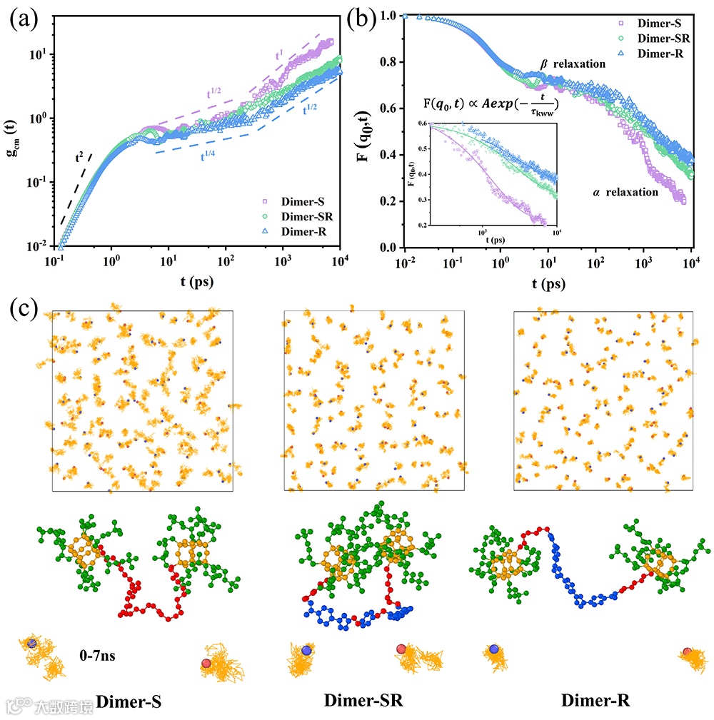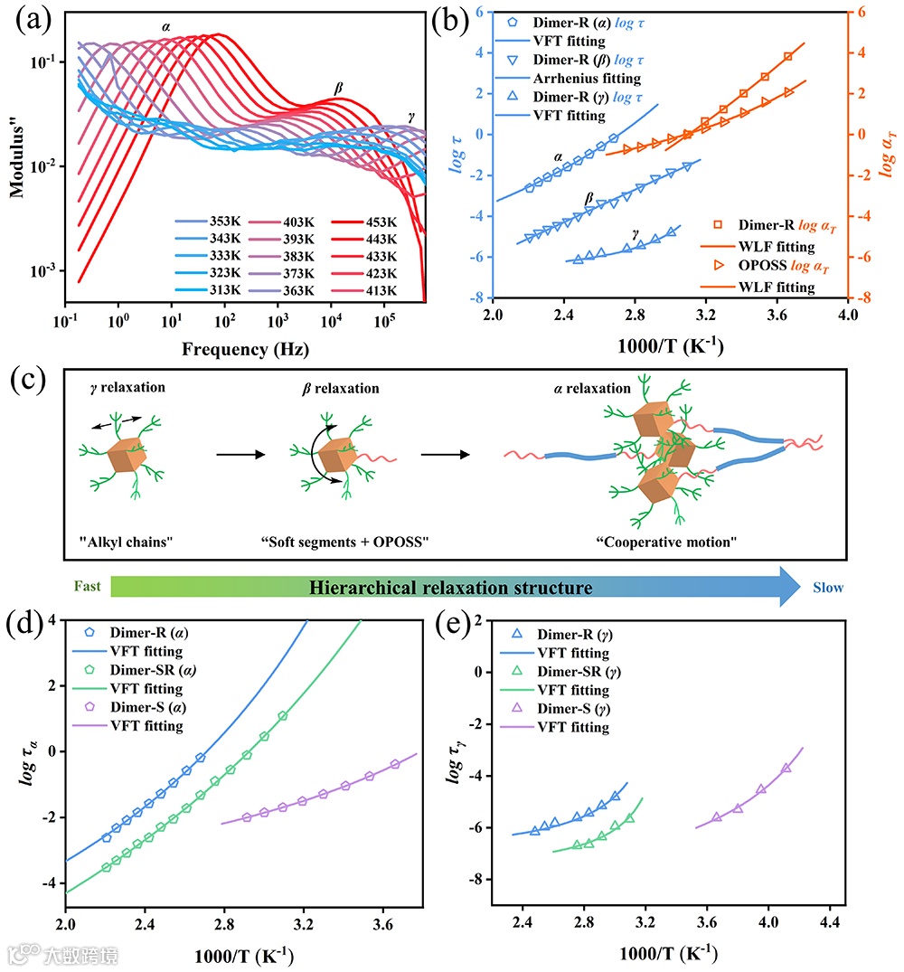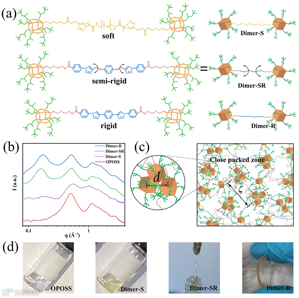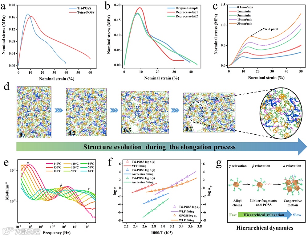 受材料单体结构临界尺寸效应(5-7nm)的影响,尺寸小于5nm的颗粒单体往往由于快速的松弛动力学表现为高流动性的液体,而引入超分子相互作用后,颗粒单体间强的相互作用会导致材料脆性。因此,基于小尺寸且无超分子相互作用的颗粒单体来构建粘弹性材料是一个非常具有挑战性的科学难题。基于该课题组近期对亚纳米分子簇基杂化材料的系列实验和理论模拟研究(Angew. Chem. Int. Ed.2021, 60, 22212-22218;Angew. Chem. Int. Ed.2021, 60, 4894-4900)发现,通过精准合成多层级动力学拓扑分子簇结构的策略不仅可以有效打破传统材料单体结构的临界尺寸效应(5-7nm)的影响,实现这些颗粒材料粘弹性能的有效调控,而且精准的多层级结构单元也可以帮助我们认识外力作用下材料的多级结构动力学和力学性能的关系。