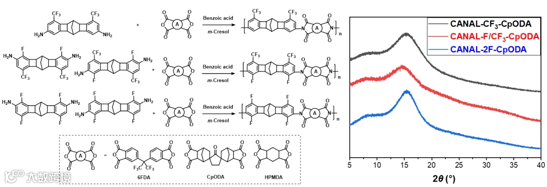 图2.基于含氟梯形二胺的CPIs的合成路线(左)以及代表CPI的WAXD曲线 (右)