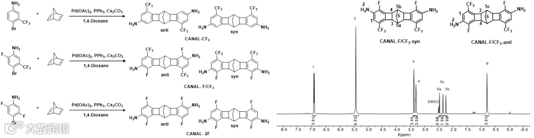 图1. 含氟梯形二胺的合成路线(左)以及代表单体的1H NMR谱图(右)